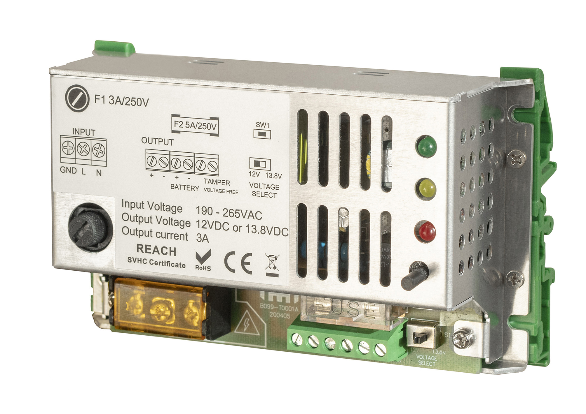 Equipped with LED indication, connection for a battery (emergency power supply), tamper contact and selector switch for 12V or 13.8V.